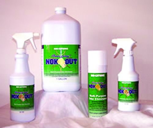ut Odor Remover and Disinfectant Type: 16 oz spray bottle, Hypoallergenic, non-toxic, biodegradable, odor-free Nok-Out deodorizes and sanitizes. Attacks and eliminates the source of the odor by oxidation, without chemicals or contaminants. Removes odor caused by pets, urine, mold, mildew, and tobacco smoke. Works on carpets, upholstery and other fabrics. Add to the wash or spray in the litter box. For best effects, it should come into direct contact with the odor source. When using for disinfectant purposes, apply and allow to remain wet for approximately ten minutes. Wipe surface with a damp cloth or let air dry.